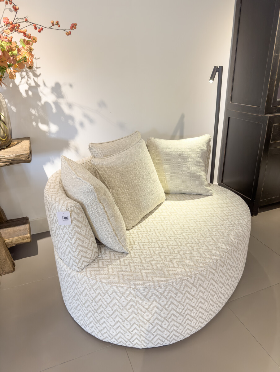 De prijs van het showroommodel zoals afgebeeld staat niet meer in de showroom, maar is wel te bestellen. Deze uitvoering met een luxe jacquard geweven stof met bijzonder grafisch dessin is € 1985,-