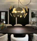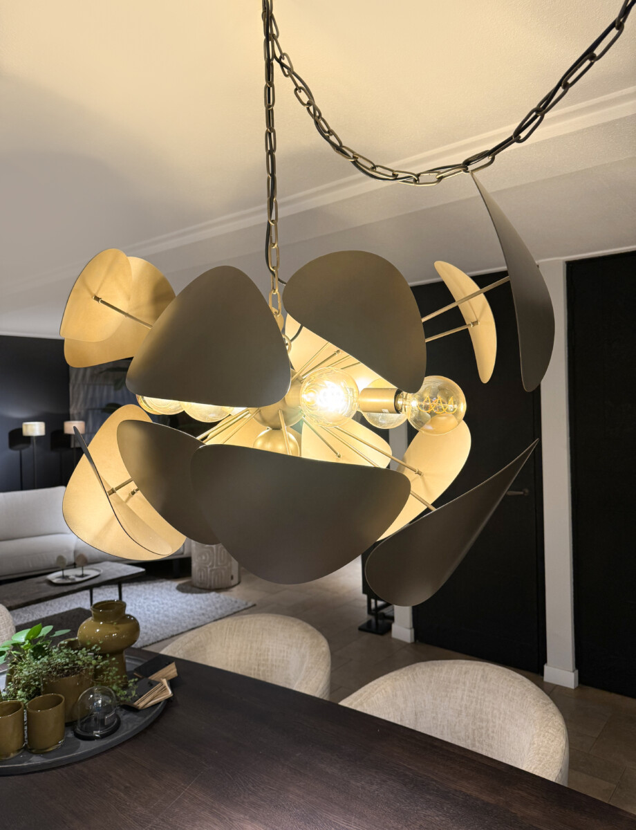 Deze spectaculaire hanglamp is als een geëxplodeerde komeet in de ruimte waarbij de delen om het midden blijven zweven. Door deze delen, gemaakt van plaat metaal zijn de lichtbronnen zijn deels uit het zicht en het licht weerkaatst op de goud-bronskleurige binnenkant, wat zorgt voor een sfeervol en warm lichteffect. Het licht accentueert de metalen bladen, waardoor deze nog meer lijken te zweven. De verlichting maakt van de lamp als geheel een prachtig kunstobject.