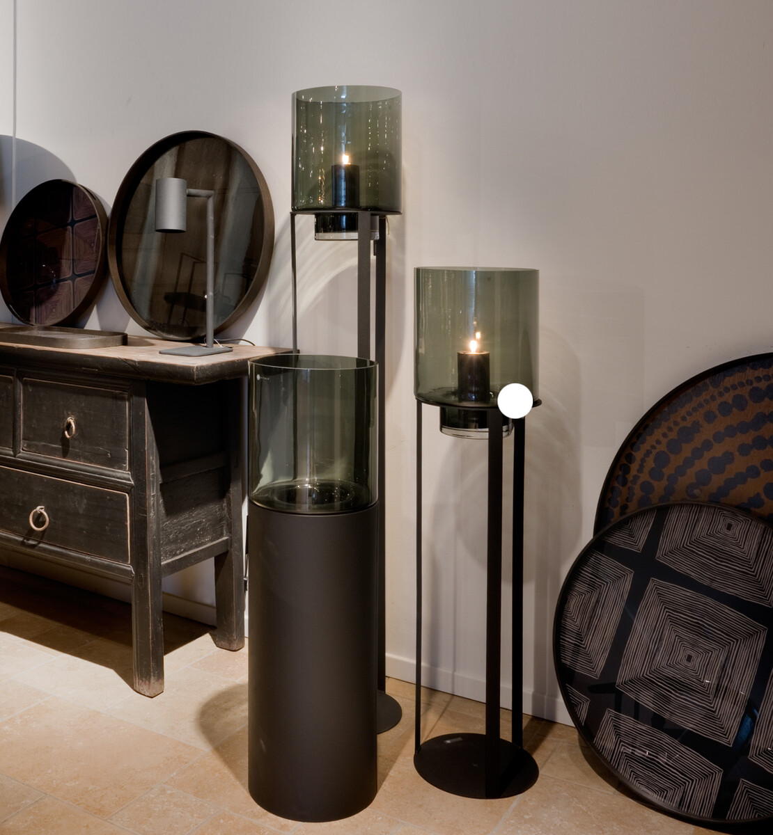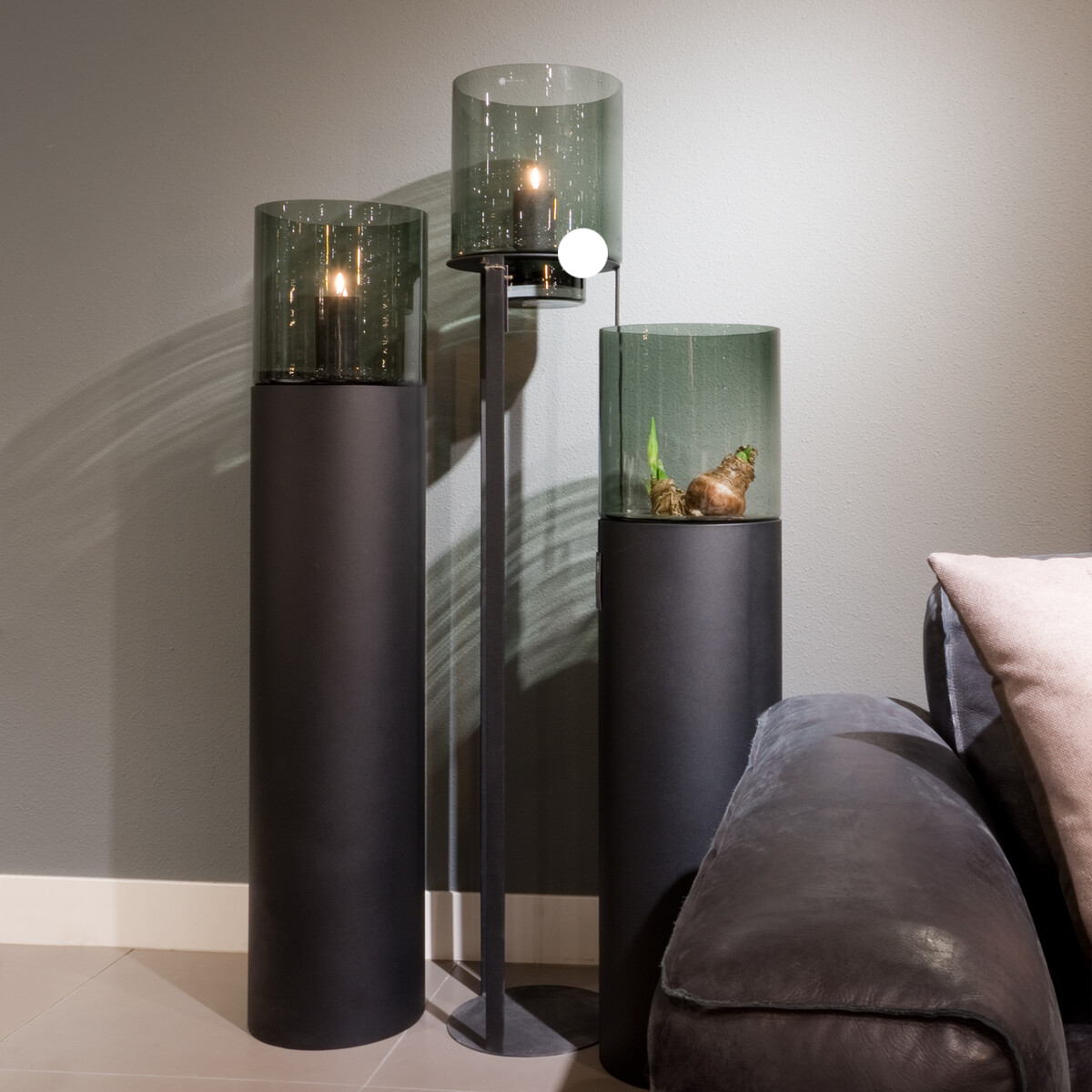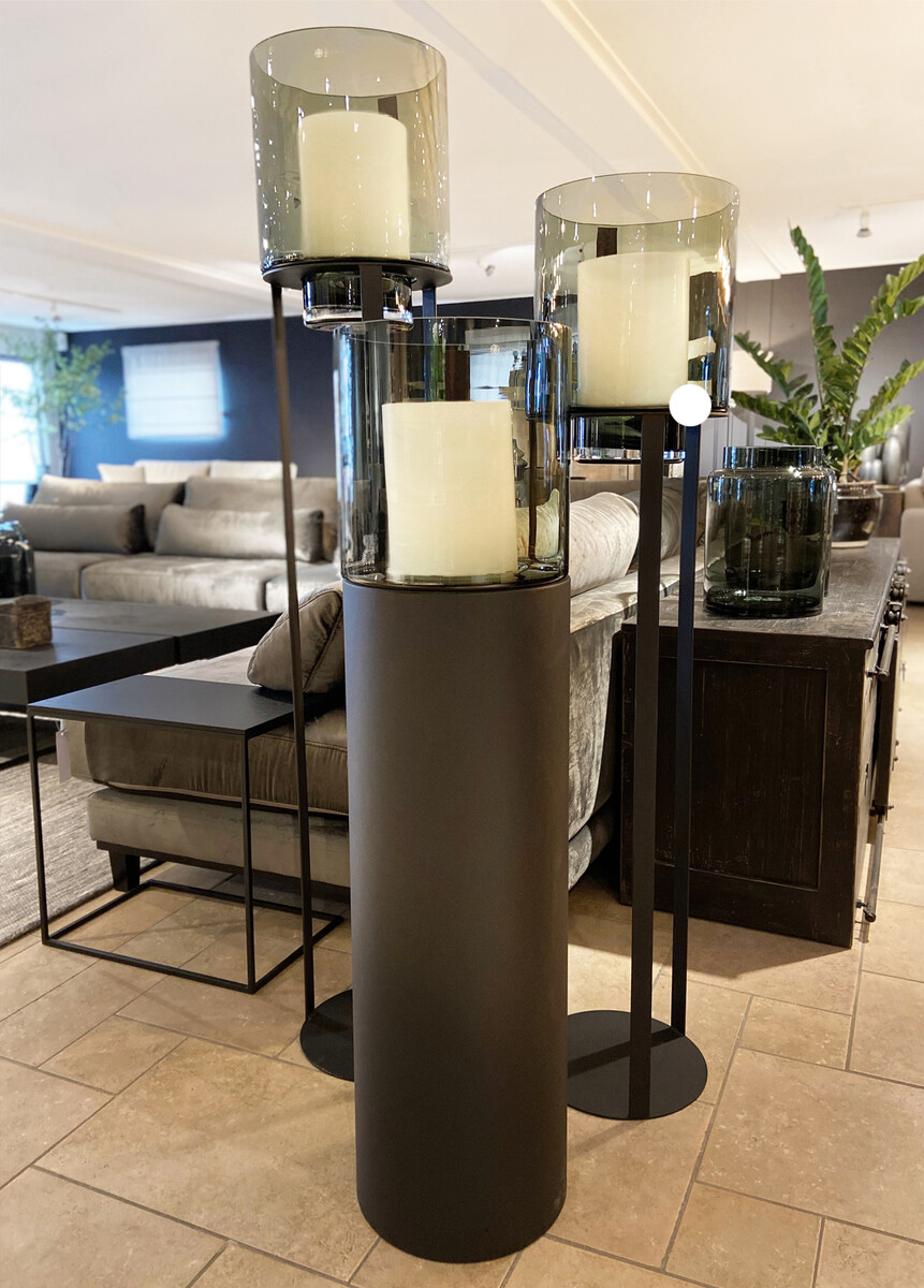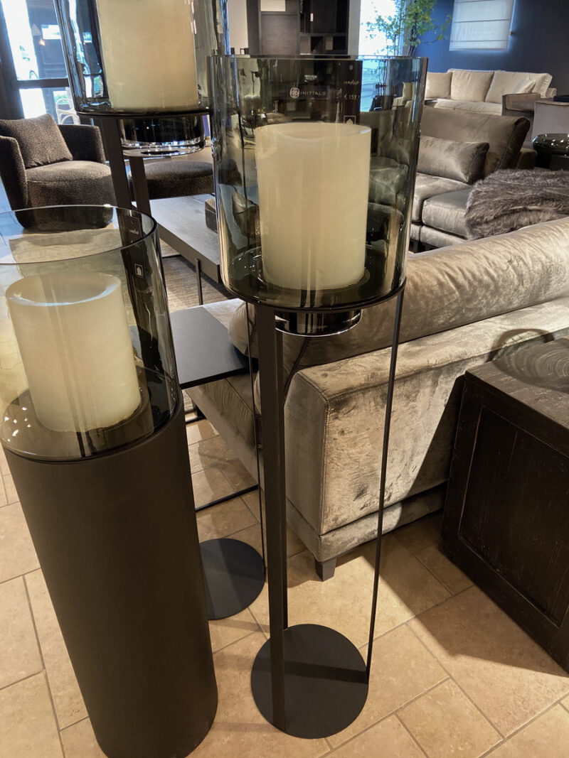Sfeervolle Hurricane Stands met Open Frame gemaakt van gepoedercoat mat zwart zinc, en een Hurricane van smoked glas. Vult iedere lege plek en is ook mooi om bij een entree te plaatsen.