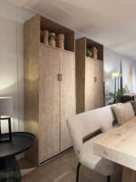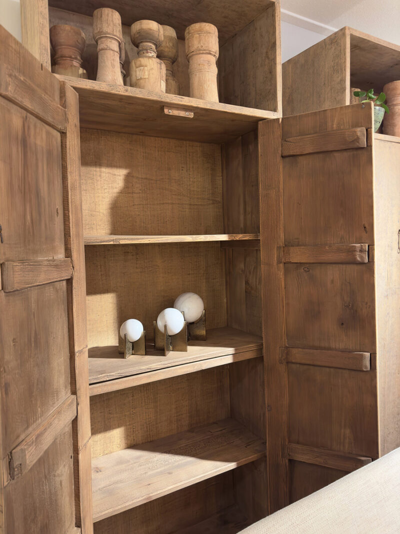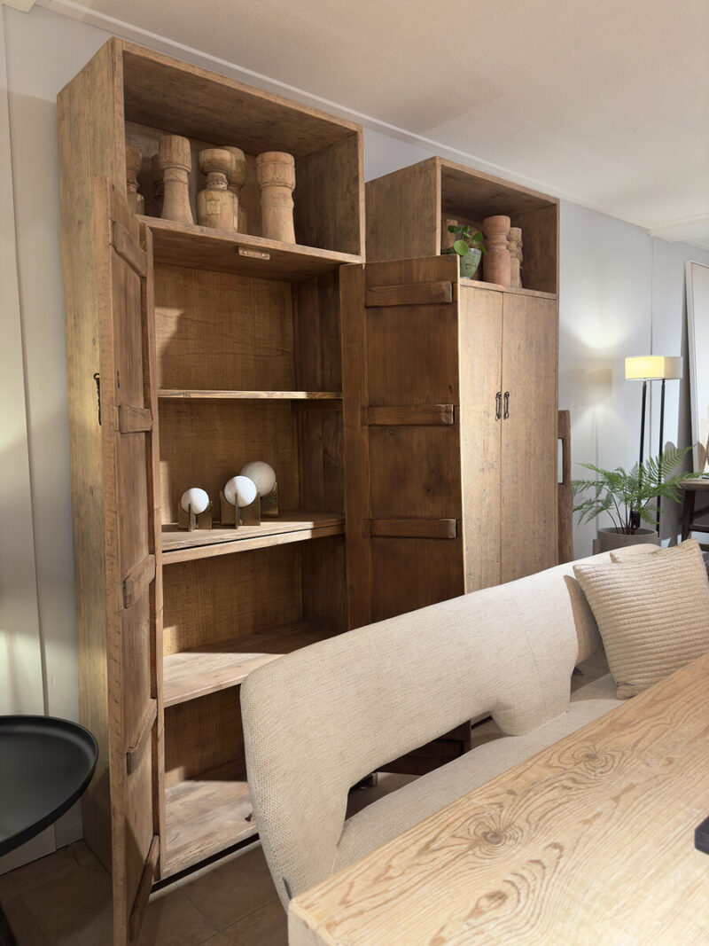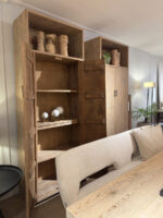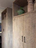 Kast Guusje is een tabs toelopende kast van massief old pinewood met minimalistisch rustiek ijzeren beslag. Binnenin 4 legplanken en een open vak bovenin om je woonmoois in the laten stralen.