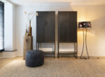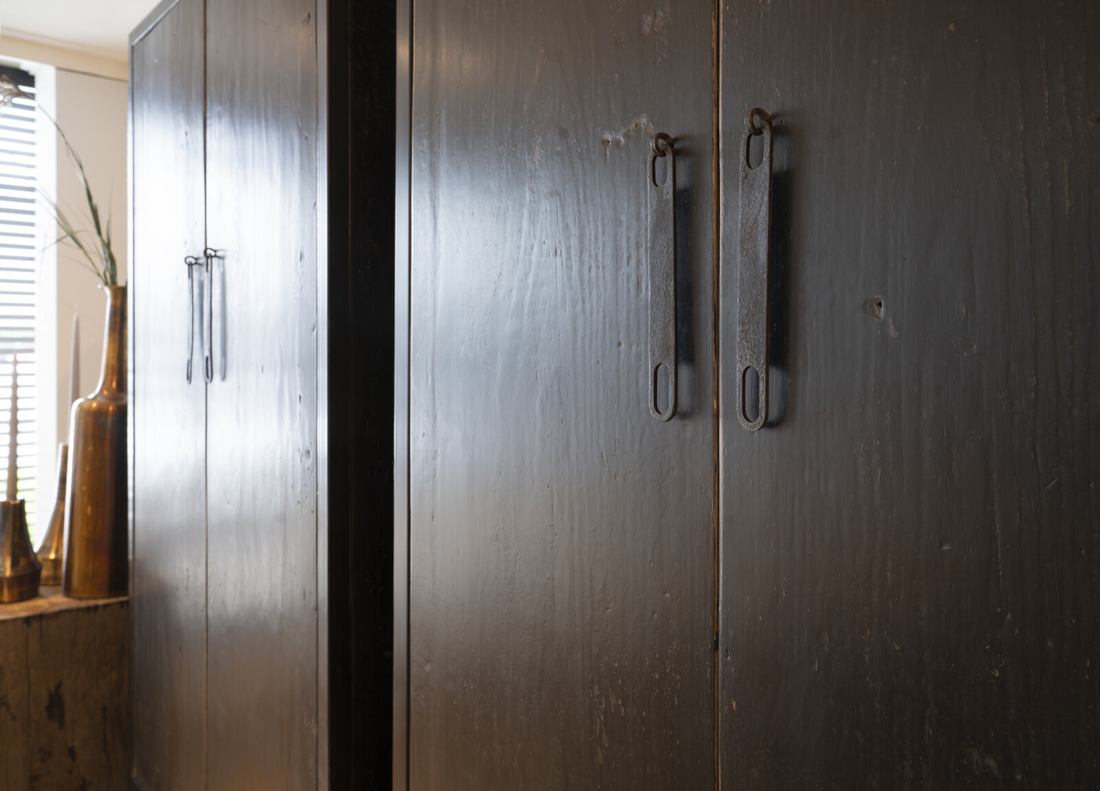 Het cabinet heeft gesloten deuren en een legplank. Het oppervlak van het hout heeft een mooie voelbare nerf structuur en is artisanaal bewerkt met een donkere beits.