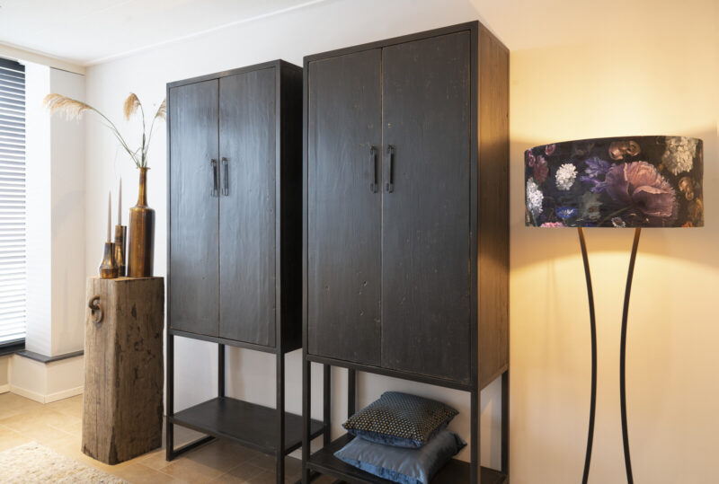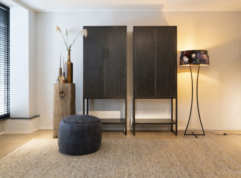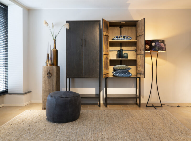 De kast Ted uit de RAW Nero Collectie is gemaakt van een donker metalen frame met Dark Elmwood planken waar je je woonmoois in kunt tentoonstellen.
