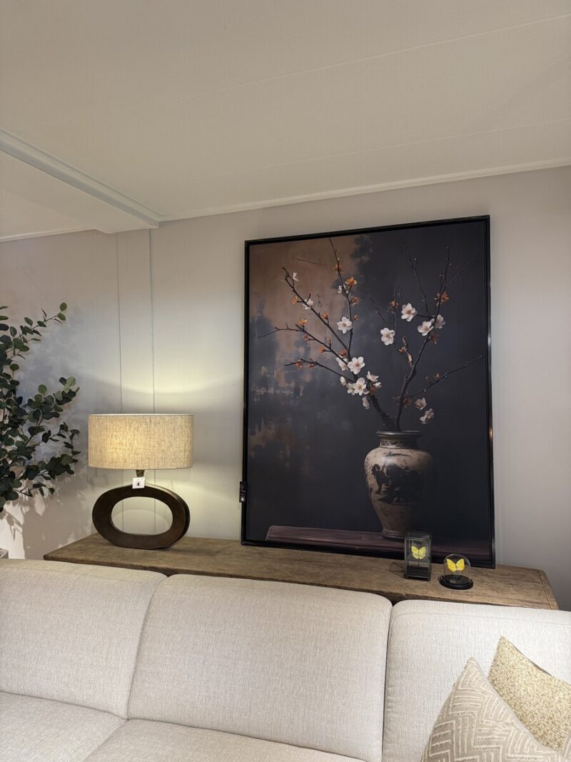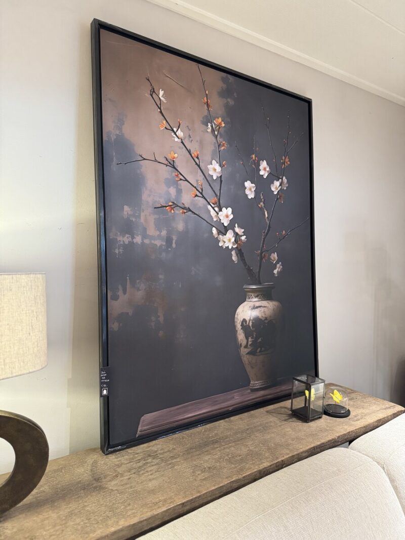 Foto van een Vaas Met Kersenbloesem in een ingetogen donker interieur.