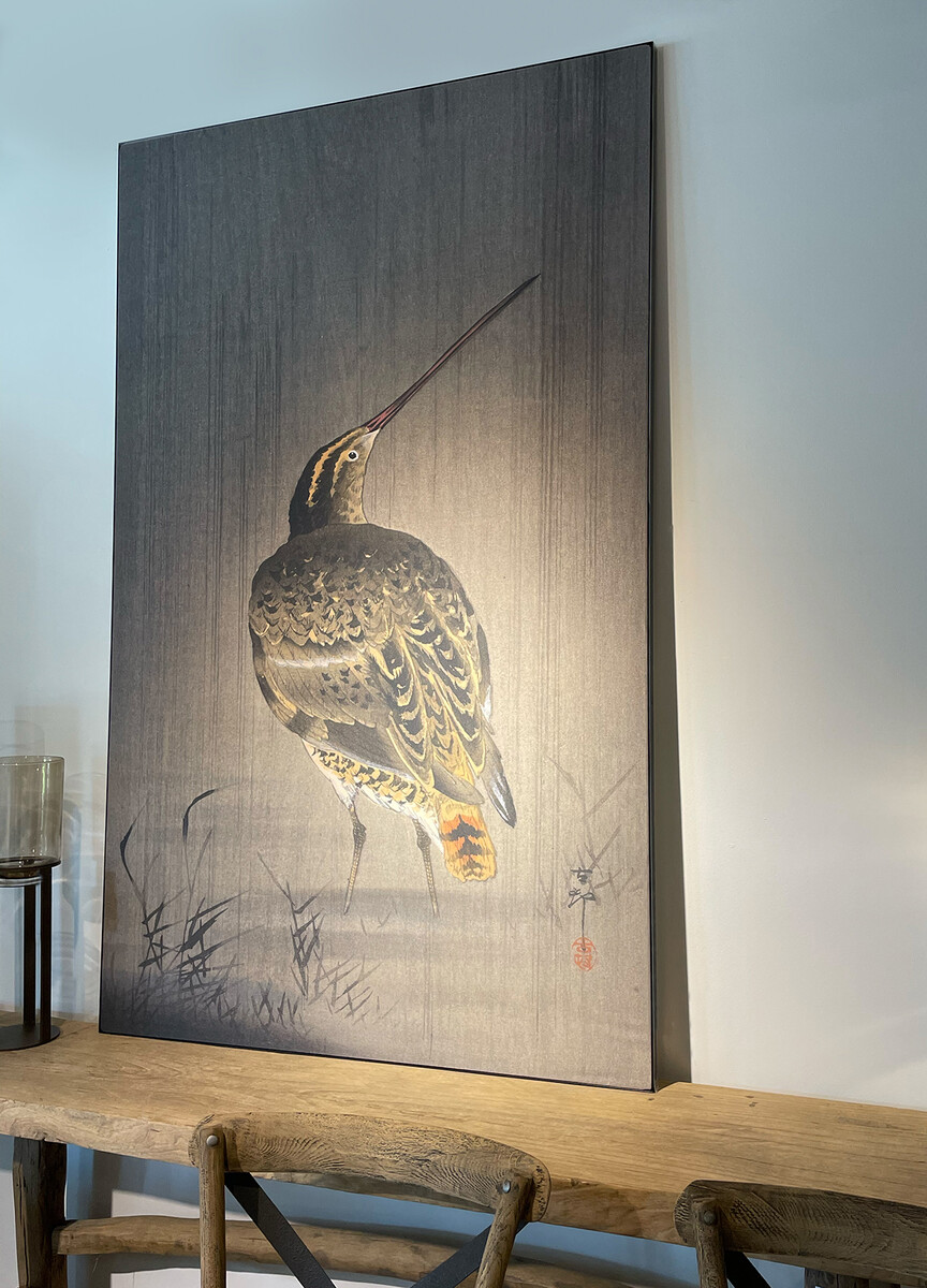 Reproductie van kunstwerk “Snip in de regen” van de Japanse kunstenaar Ohara Koson.