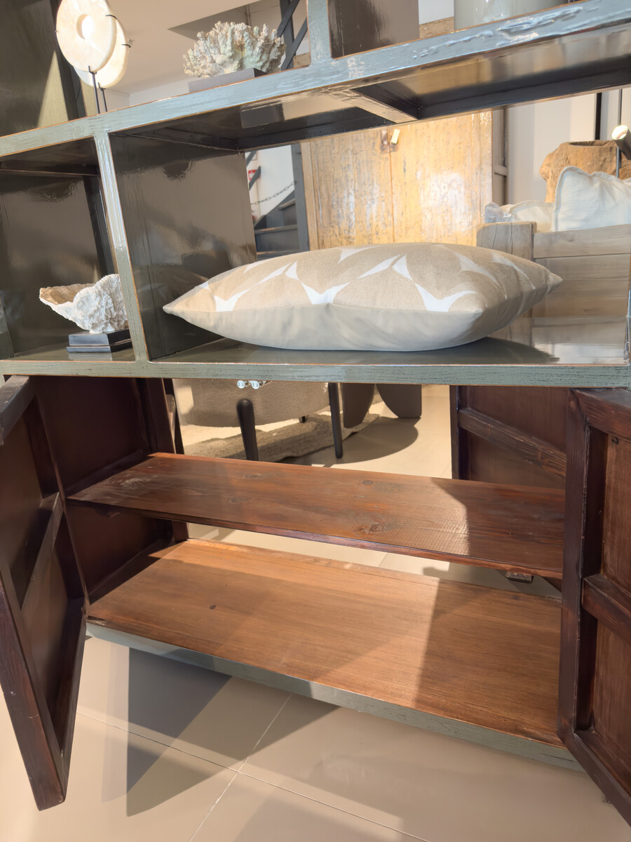 Roomdivider Mees, gelakt in een donker groene tint heeft zeven open vakken om je woonvoois in te doen laten stralen, en onder een compartiment met een legplank en vier push-to-open deuren, twee aan de ene kant en twee aan de andere kant. Wat een eyecatcher in de ruimte!
