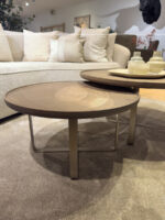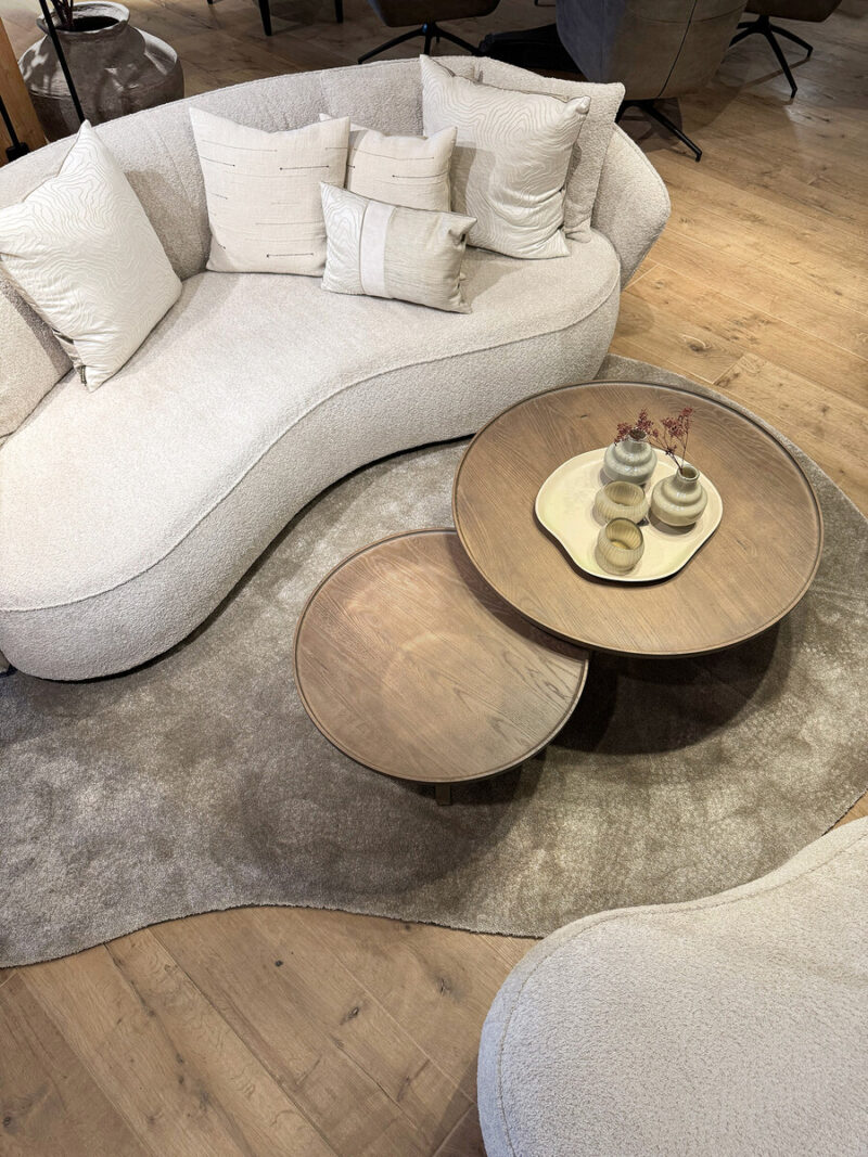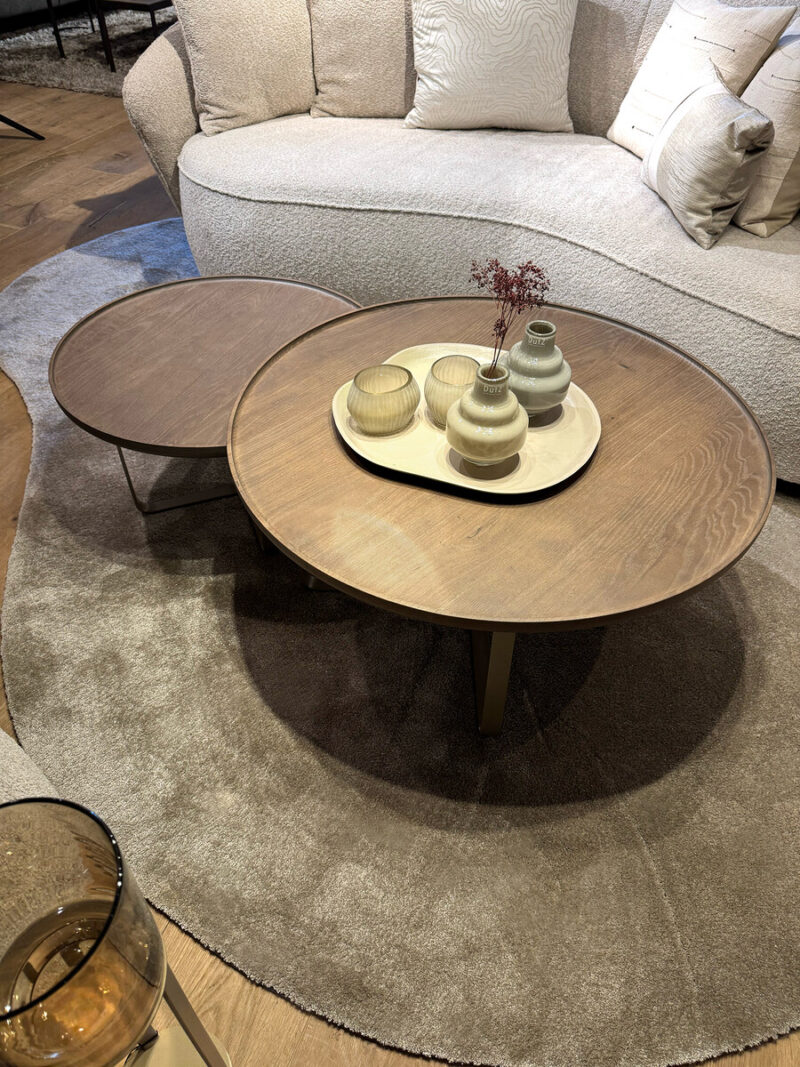 Salontafels met massief eikenhouten blad en opstaande rand.