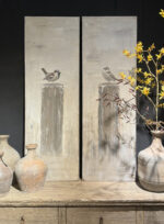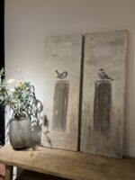 De Set Schilderijen Vogels op paaltjes wordt met de hand geschilderd met Acrylverf. Elk stuk is uniek.