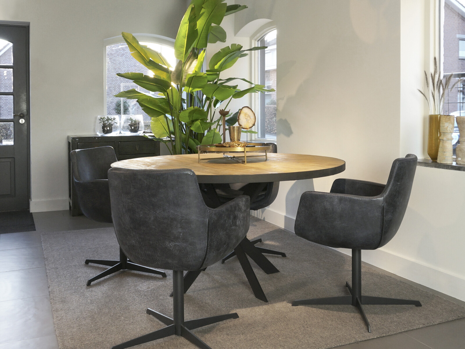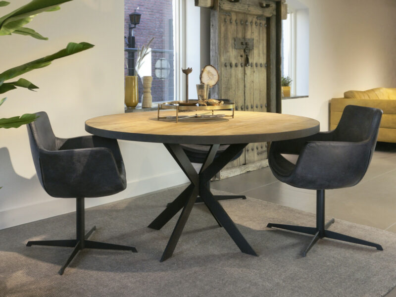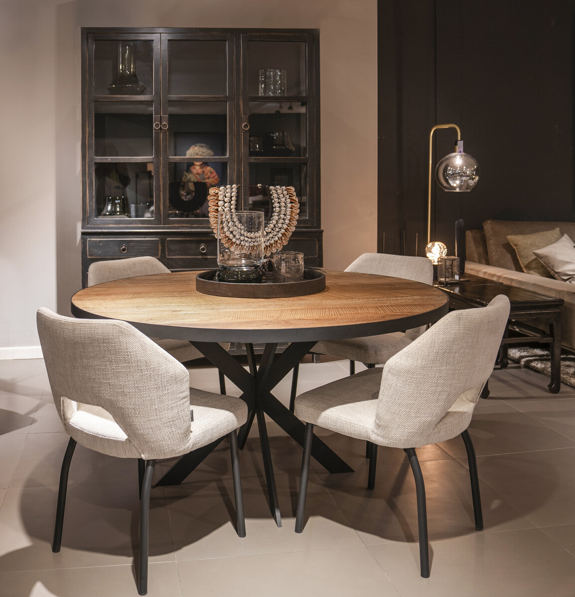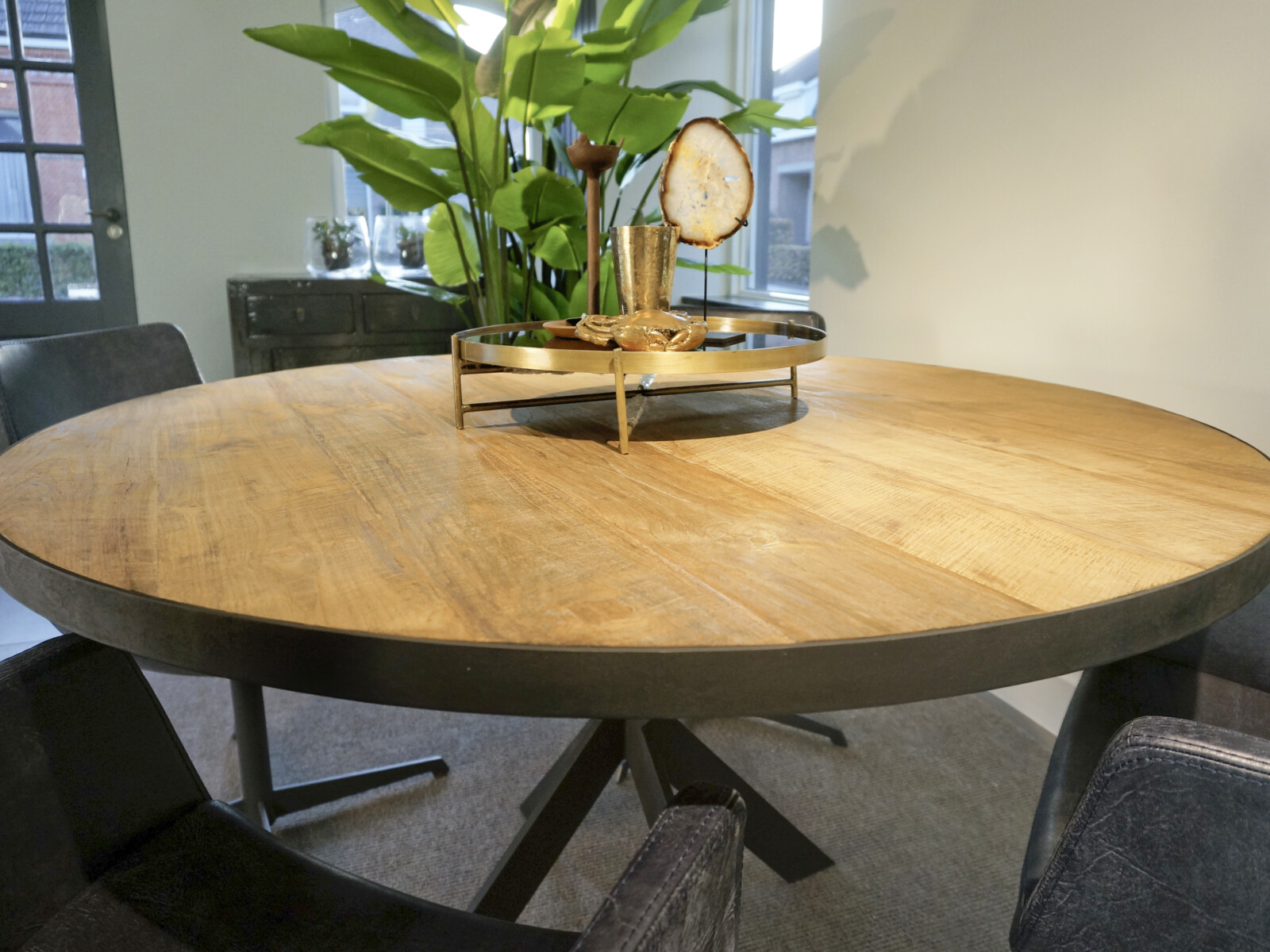 De STEEL Ronde Diner tafel is gemaakt van massief teakhout met mat zwart metalen frame en kruispoot. Afgebeeld: de 140 cm variant.