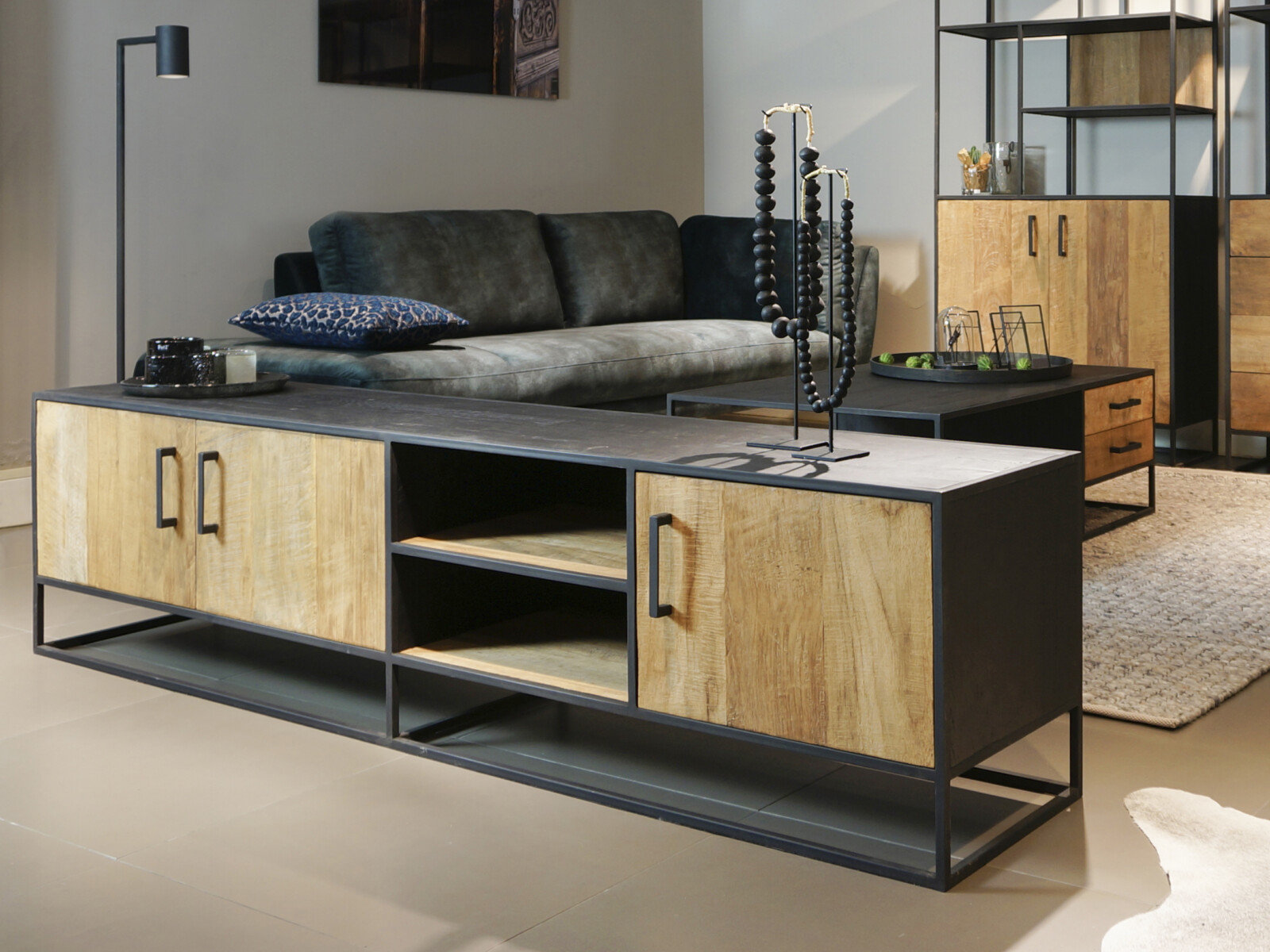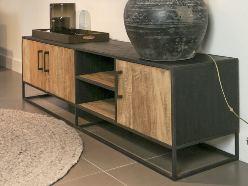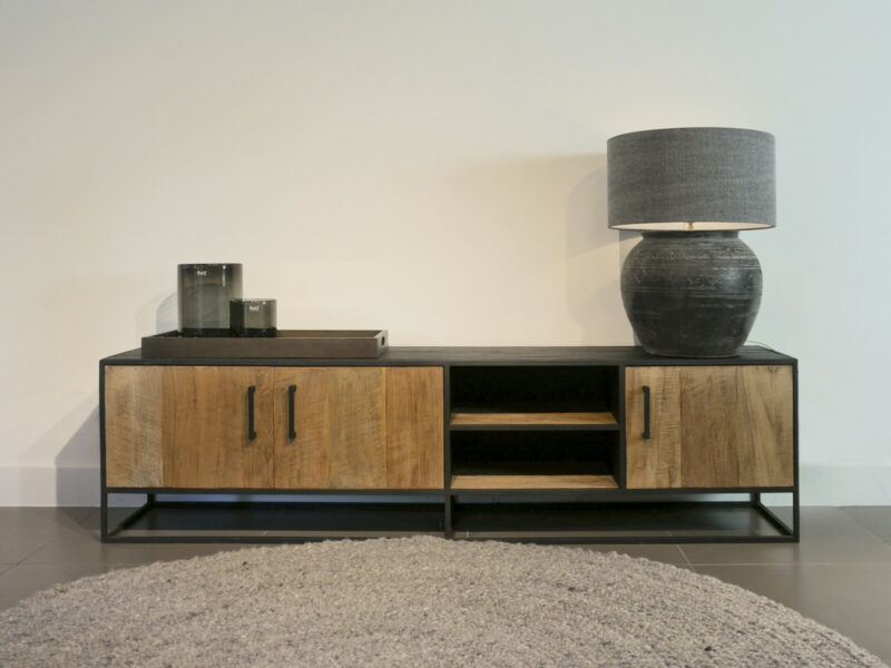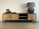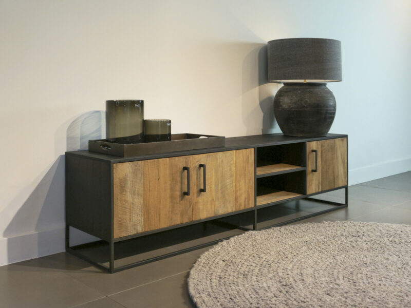 STEEL TV dressoir 200 is gemaakt van massief teakhout met mat zwart metalen frames, en heeft flankerend drie deuren met legplank en twee nissen.
