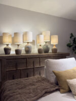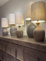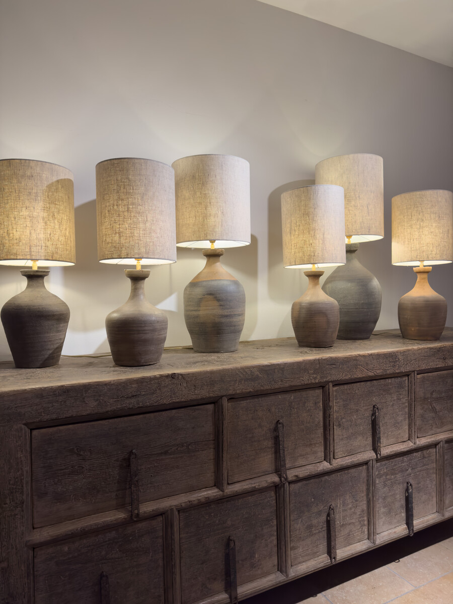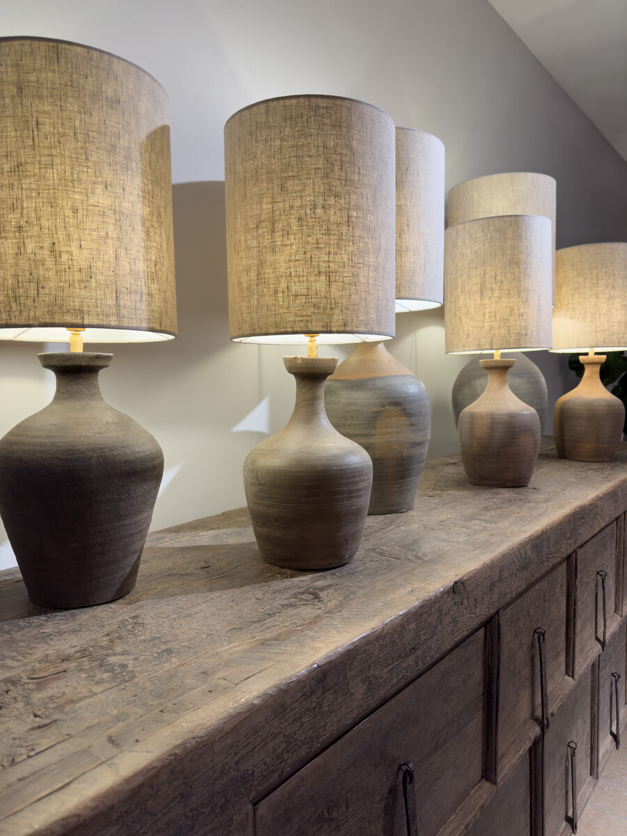 Deze tafellampen hebben prachtige warme terra tinten, gemaakt van unieke wijnkruiken uit de Henan periode en een naturel linnen kap.