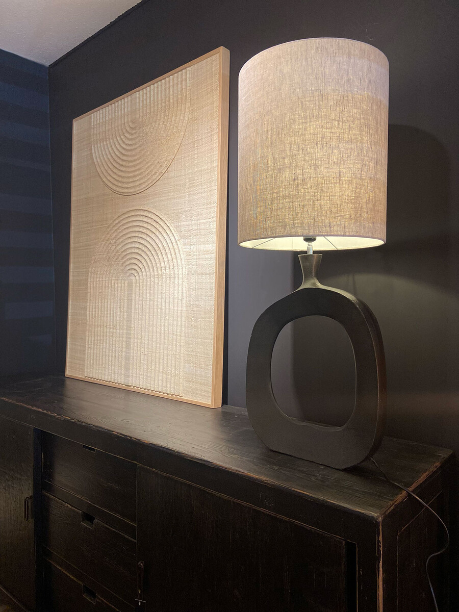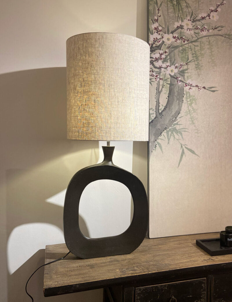 Lamp met verticale ‘O’ lampvoet van gegoten metaal, inclusief linnen kap.