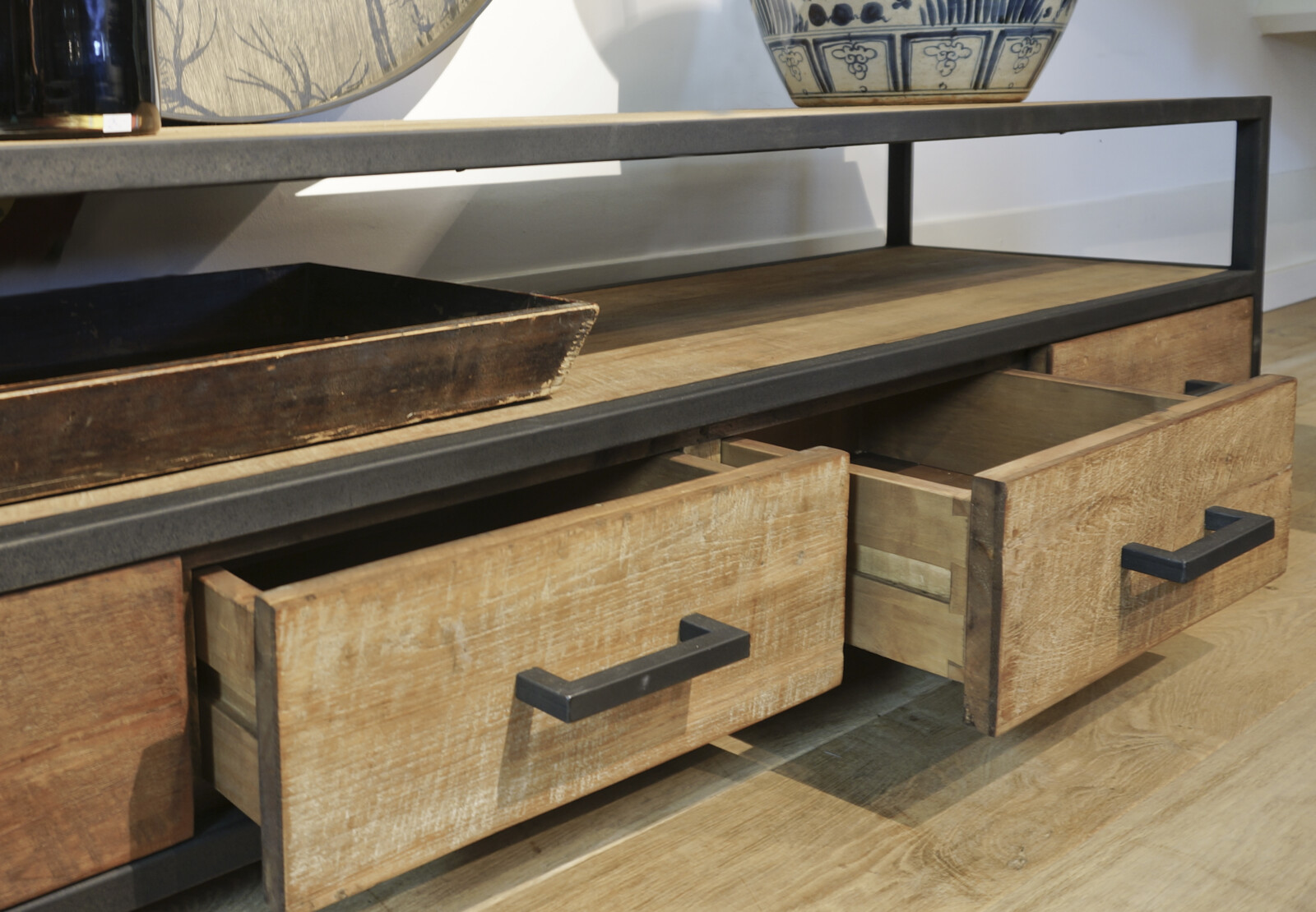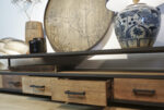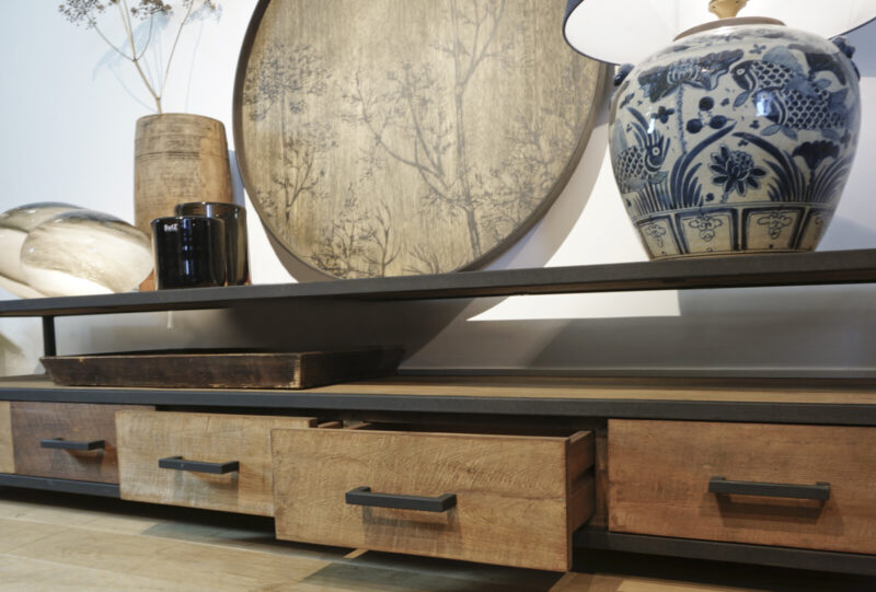 TV dressoir 170 METAL is gemaakt van massief teakhout met mat zwart metalen frames, een ruime nis, en vier ruime laden. De meubels uit de METAL Collectie zijn gemaakt van oud recycled teak hout, en hebben een zwart stalen frame met lades waar gemakkelijk van alles in opgeborgen kan worden. Het teak hout is doorleefd, met glad oppervlak, en een warme uitstraling. Gecombineerd met de industriële mat zwarte stalen frames zijn ze een stoere verschijning.