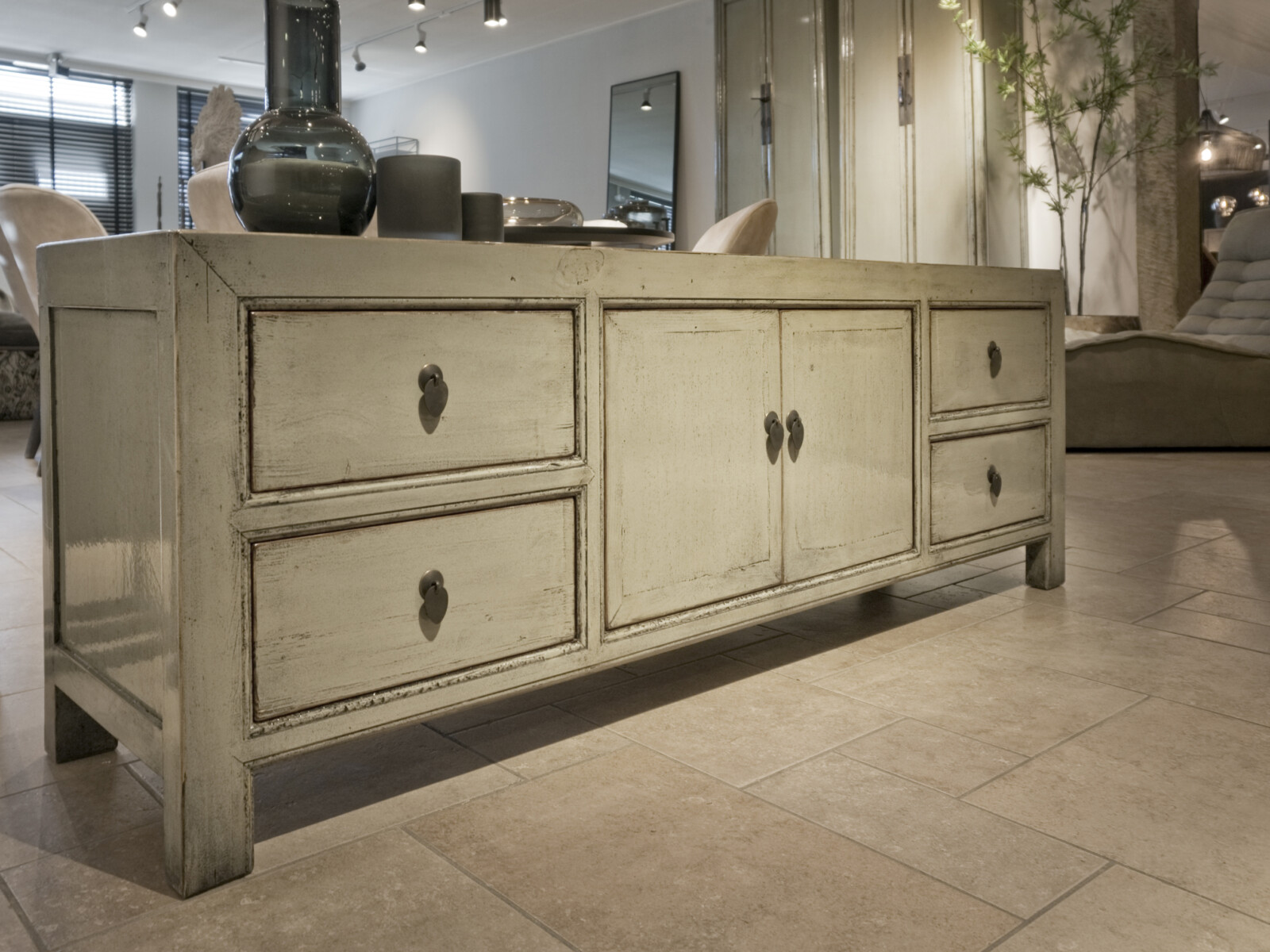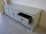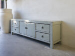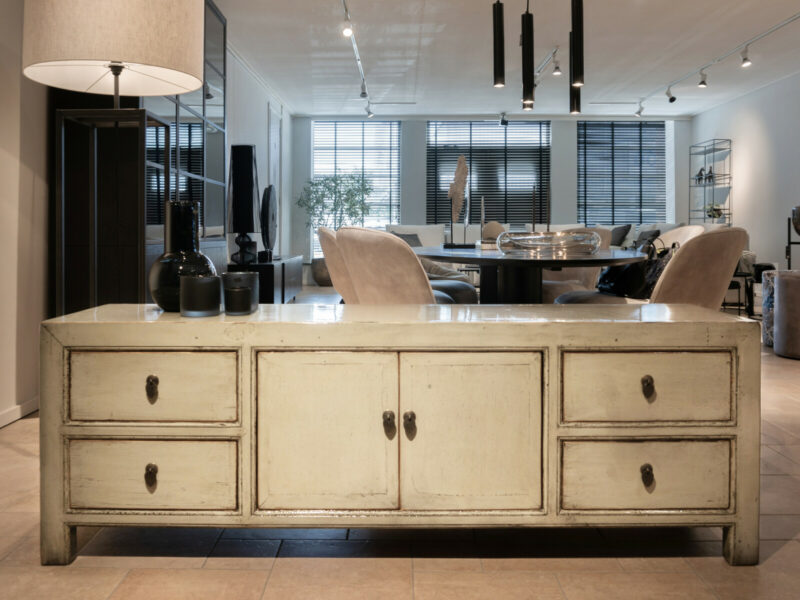 TV Dressoir Tibbe 180 ORIENTAL Lacquer Jade is gemaakt van massief oud grenen met een hoogglans lak in een lichte jade groene kleur, en ornament beslag van metaal. Het TV-dressoir heeft flankerend vier laden, en in het midden twee deuren en een legplank. De hoogglans lak wordt artisanaal met de hand vervaardigd. Daarom is geen van deze kasten exact hetzelfde.