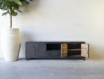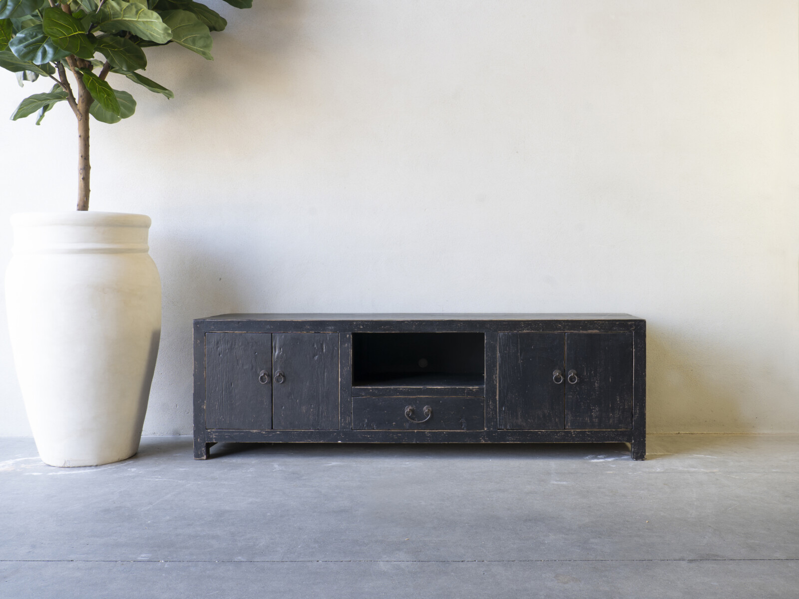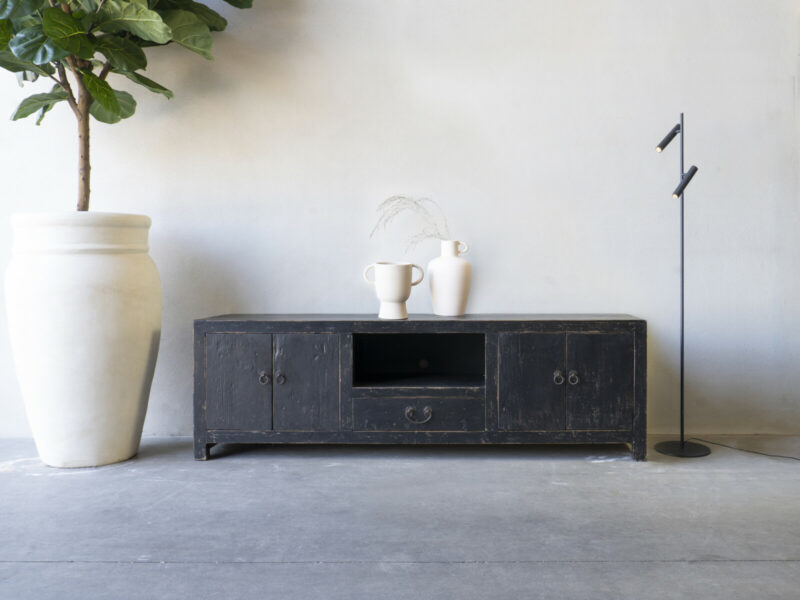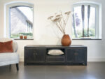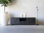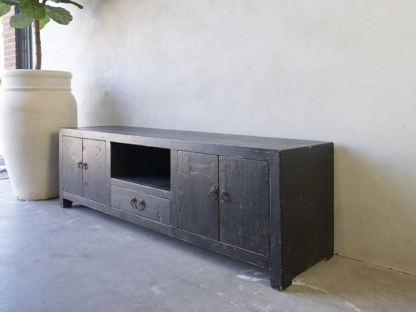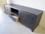 TV Dressoir Stijn 180 CLASSIC Black is gemaakt van massief olmen hout met een mooie nerf structuur en een zwarte patina. Het TV-dressoir heeft flankerend vier deuren, waarbinnen twee legplanken, en in het midden een nis en een ruime lade.
