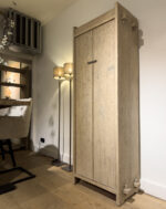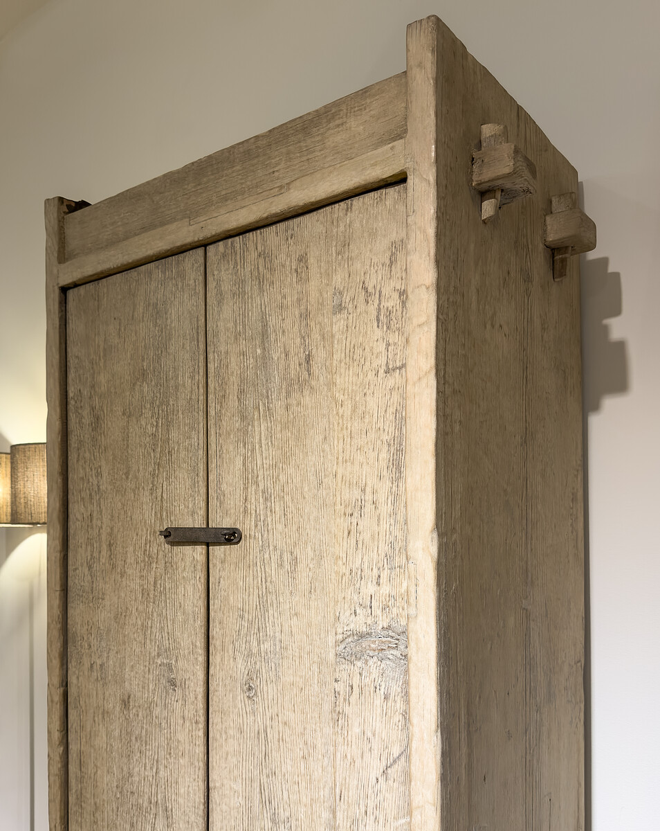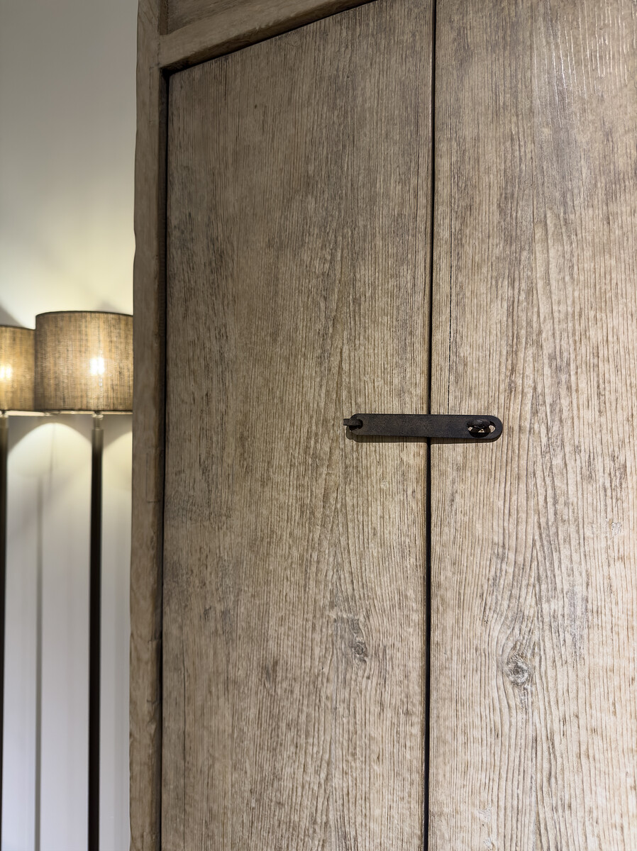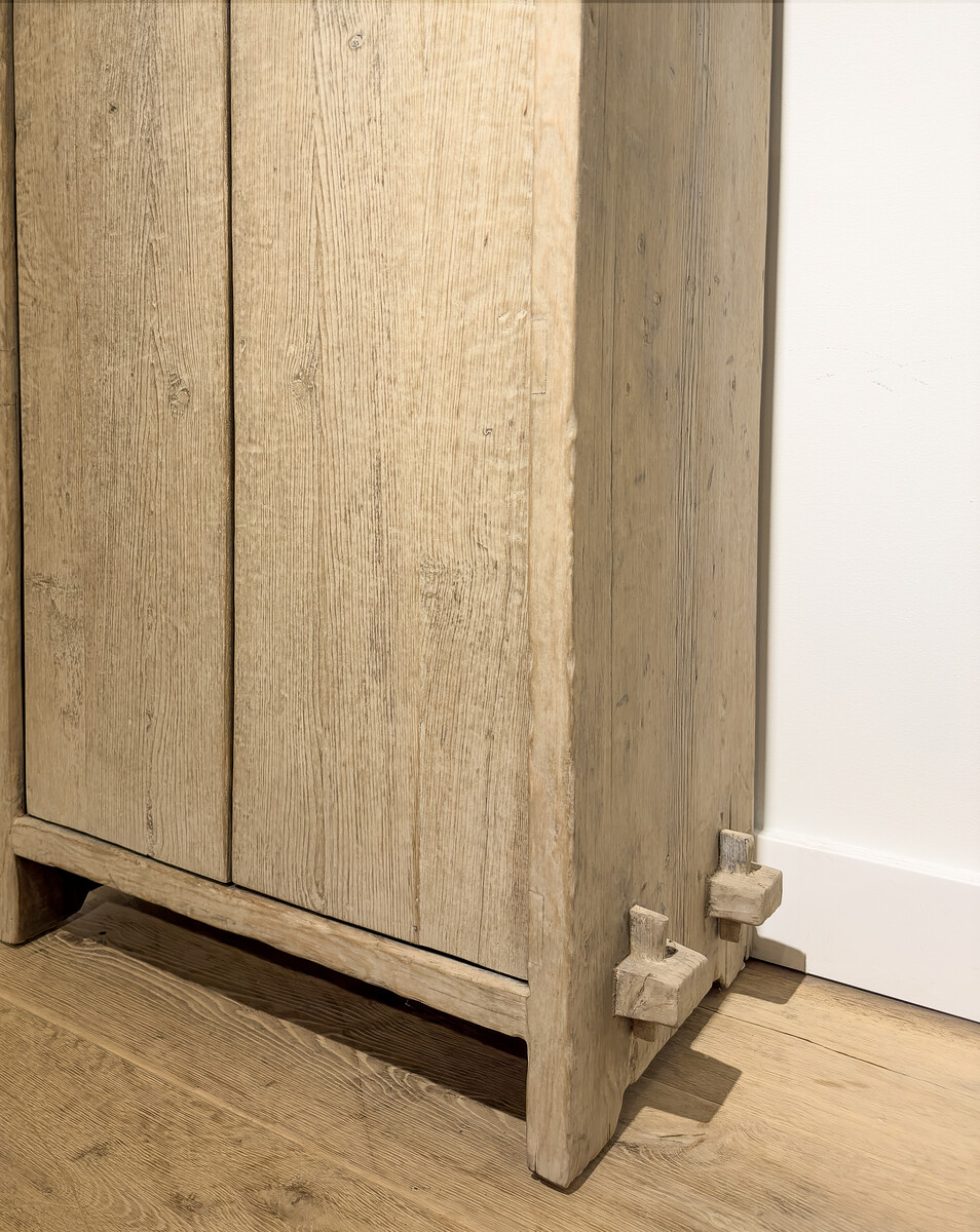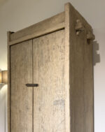Tweedeurs Kast Pure Natural Elmwood is gemaakt van verweerd olmenhout met een mooie nerf structuur, opvallende klassieke houtverbindingen, en rustiek ijzeren beslag. Binnen in heeft de kast vier legplanken en een donkere patina wat een bijzonder contrast geeft.