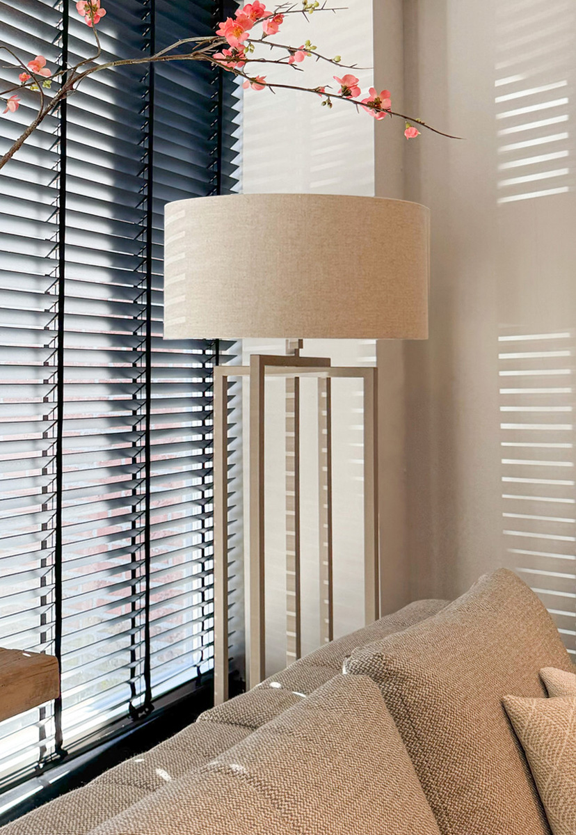 Tijdloos model vloerlamp met een kruispoot metalen onderstel in de lichte kleur ‘quartz’ een naturel linnen kap.