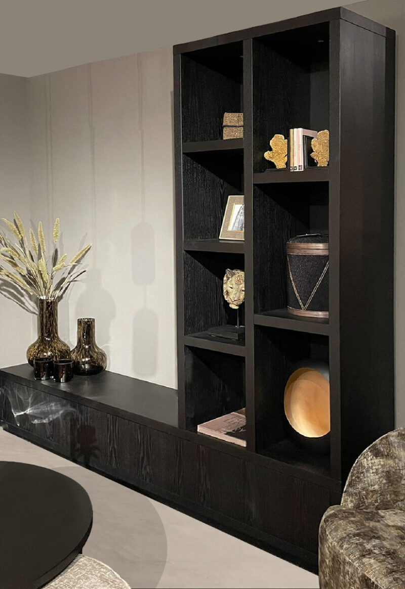 Je kunt deze kast helemaal zelf samenstellen qua afmetingen, vlakverdeling van de open vakken, laden en deurtjes met ‘push-to-open’ systeem, features als ingebouwde spots en kleuren premium eiken fineer. De elementen zijn los verkrijgbaar: de horizontale elementen als ook het verticale element om eventueel in te bouwen in een nis. Of ze zijn samen te combineren tot een wandkast naar wens.