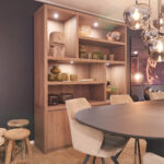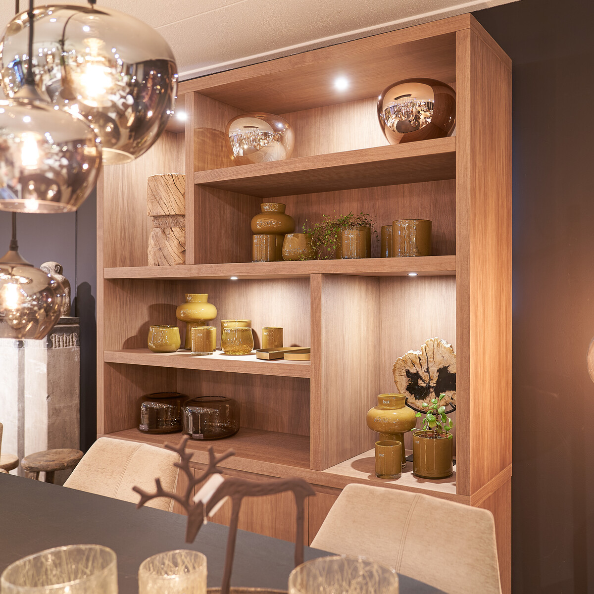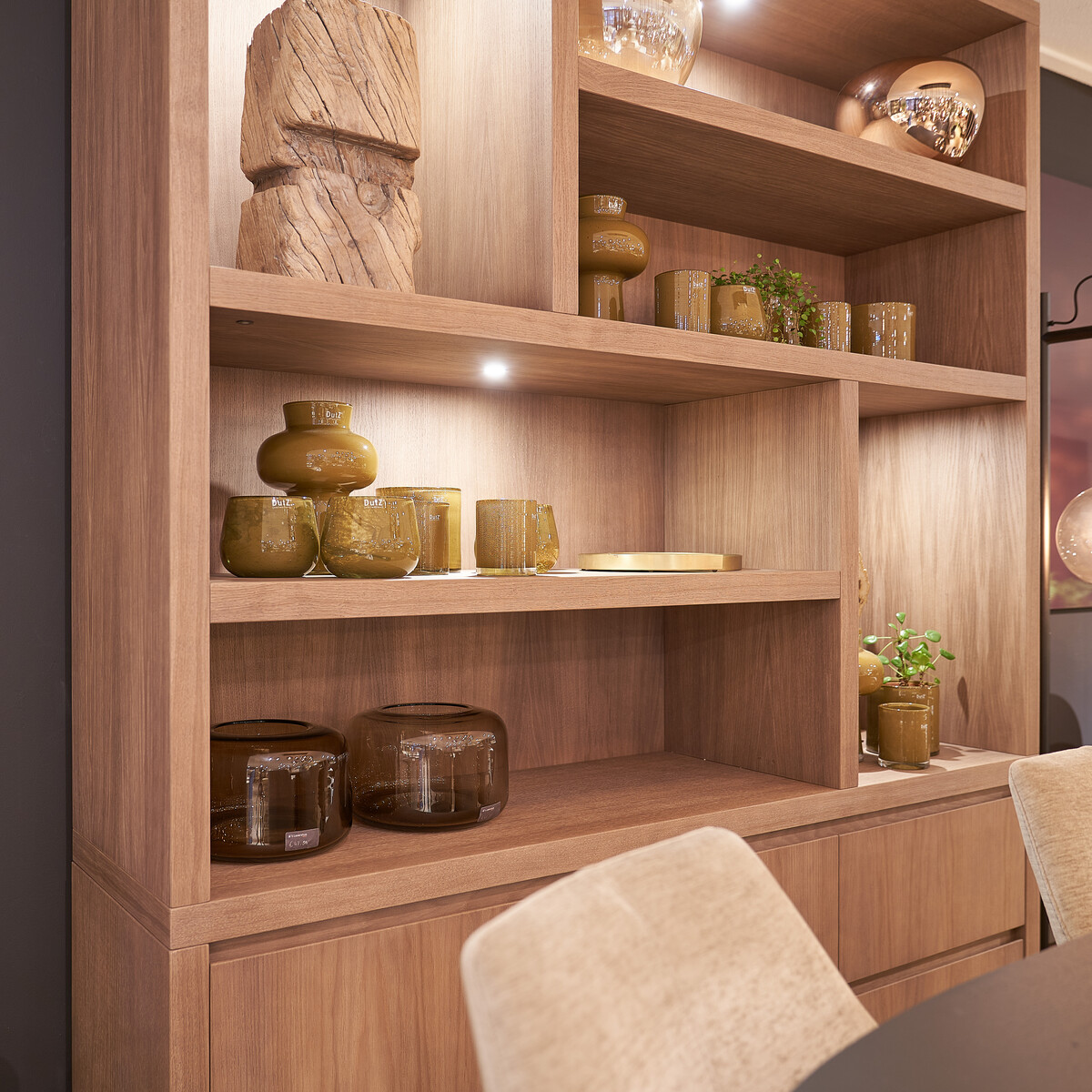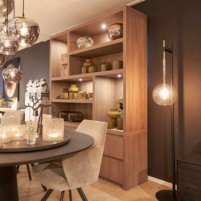 Je kunt deze kast helemaal zelf samenstellen qua afmetingen, vlakverdeling van de open vakken, laden en deurtjes met ‘push-to-open’ systeem, features als ingebouwde spots en kleuren premium eiken fineer.