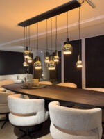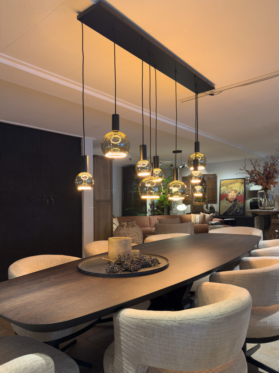 Hanglamp Segula met negen fittingen is een moderne stalen lamp uit de Segula 007 serie van Ztahl. Deze brede hanglamp ziet er prachtig uit boven een eettafel. Door de verschillende hoogtes heeft deze lamp een speelse uitstraling. In de showroom uitgevoerd in RAL 9005 met structuur: Artikel 40074-9005.